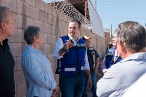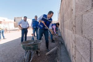 Ciudad de Chihuahua, Chih., La mañana de este lunes, el alcalde Marco Bonilla, realizó un recorrido de supervisión en la calle Encino e Industrias de la colonia Nombre de Dios, donde el Consejo de Urbanización Municipal (CUM) realiza la pavimentación con concreto hidráulico bajo el esquema de coparticipación ciudadana 50/50, donde el Municipio aporta la mitad y los vecinos la otra.