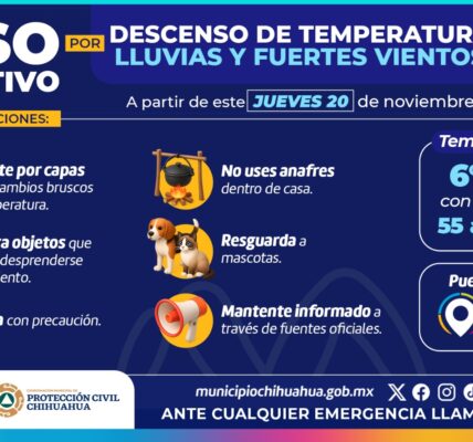 Localidades serranas como El Vergel, Guachochi y Creel seguirán con temperaturas máximas frescas, entre los 24°C y 26°C, pero con mínimas bajo cero al amanecer. Protección Civil pide a la población mantenerse informada y proteger a niños, personas mayores y mascotas ante los cambios bruscos de temperatura.