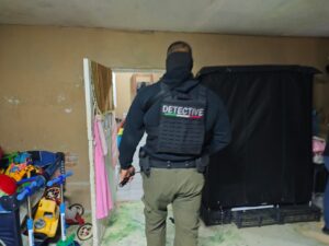 Chihuahua, Chih., La Secretaría de Seguridad Pública del Estado participó en un cateo realizado en la colonia Cerro Coronel de la ciudad de Chihuahua, como parte de una investigación por homicidio doloso. Durante la diligencia, se aseguró a un hombre de 25 años identificado como Edgar L. G., así como un arma de fuego y presunta droga.