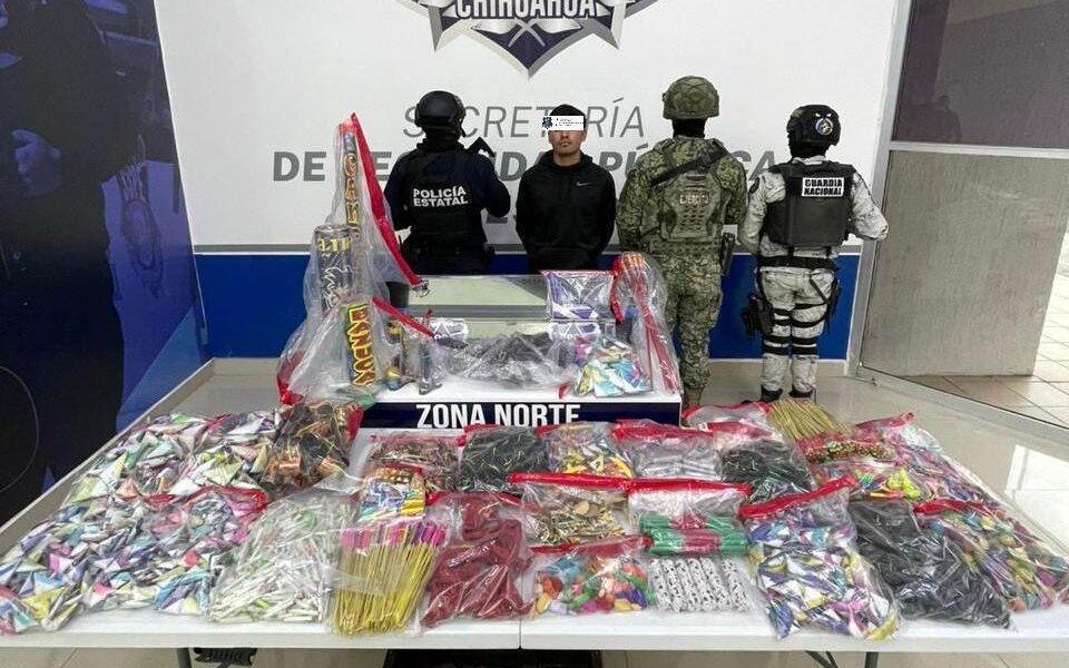 Juárez, Chih., La Secretaría de Seguridad Pública del Estado, a través de la Subsecretaría de Despliegue Policial, detuvo a un joven de 22 años en la colonia Centro de Ciudad Juárez por presunta violación a la Ley Federal de Armas de Fuego y Explosivos. Durante la intervención se aseguraron 4 mil 402 piezas de pirotecnia que eran transportadas y almacenadas sin cumplir con la normatividad vigente.