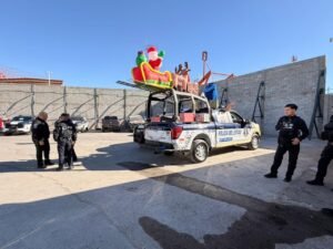Juárez, Chih,, Alrededor de 350 elementos de la Secretaría de Seguridad Pública del Estado (SSPE) participaron en un recorrido navideño por diversas avenidas y colonias de Ciudad Juárez, con el objetivo de fomentar la proximidad social y la convivencia con la ciudadanía. Durante la actividad, se entregaron juguetes y bolsas de dulces a personas en situación de vulnerabilidad, especialmente niñas y niños.