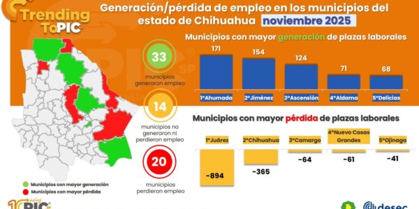 Chihuahua, Chih., Durante noviembre de 2025, el estado de Chihuahua registró la pérdida de 634 plazas laborales, según los datos más recientes sobre el mercado de trabajo en la entidad. A pesar de este retroceso mensual, en el acumulado de…