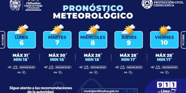 Chihuahua, Chih.- El Gobierno Municipal de Chihuahua, a través de la Coordinación Municipal de Protección Civil, informa el pronóstico del clima para esta semana, de acuerdo con datos del Servicio Meteorológico Nacional, el cual indica condiciones mayormente estables, cielos parcialmente…