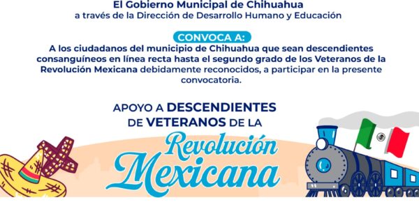 Chihuahua, Chih.- El Gobierno Municipal, a través de la Dirección de Desarrollo Humano y Educación, invita a ciudadanos de la ciudad que sean descendientes directos (hasta segundo grado) de veteranos reconocidos de la Revolución Mexicana, a participar en la convocatoria…