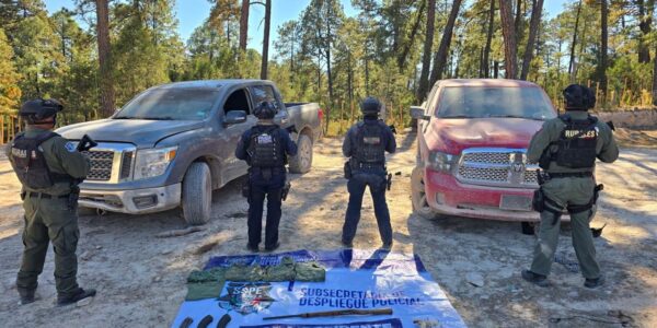 Guachochi, Chih., Como parte de las acciones de disuasión del delito implementadas en el municipio de Guachochi, la Secretaría de Seguridad Pública del Estado (SSPE), aseguró un arsenal y dos vehículos tipo pickup presuntamente utilizados por grupos criminales que operan…