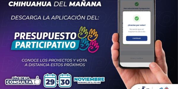 Chihuahua, Chih., El Gobierno Municipal de Chihuahua pone a disposición de la ciudadanía la aplicación oficial para participar en el Presupuesto Participativo 2026, disponible únicamente los días 29 y 30 de noviembre. Esta herramienta digital permitirá a los habitantes emitir…
