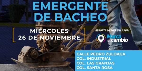 Ciudad de Chihuahua, Chih., El Gobierno Municipal, a través de la Dirección de Obras Públicas, realizará trabajos de bacheo este miércoles 26 de noviembre, mediante el programa emergente en las colonias: Industrial, Las Granjas, Santa Rosa, Palma Real, Campo Bello,…