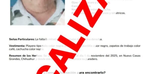 Ciudad Juárez, Chih., La Fiscalía de Distrito Zona Noroeste, localizó a un masculino de nombre Ángel A. M., de 53 años de edad, quien contaba con reporte de desaparición y/o ausencia, interpuesto el pasado 07 de noviembre, en Nuevo Casas…