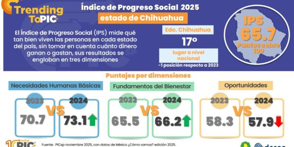 Chihuahua, Chih., Chihuahua alcanzó 65.7 puntos en el Índice de Progreso Social 2025, una cifra superior al resultado de 64.8 obtenido en 2023. Este avance refleja una mejora ligera pero constante en su desempeño general. El estado muestra resultados favorables…