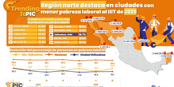 Chihuahua, Chih., Durante el tercer trimestre de 2025 la ciudad de Chihuahua se ubicó como una de las zonas urbanas con menor porcentaje de población en pobreza laboral al ocupar el octavo lugar entre treinta y nueve ciudades analizadas. El…