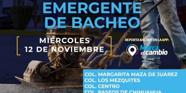 Ciudad de Chihuahua, Chih., El Gobierno Municipal, a través de la Dirección de Obras Públicas, realizará trabajos de bacheo este 12 de noviembre, mediante el programa emergente en calles de las colonias: Margarita Maza de Juárez, Los Mezquites, Centro y…