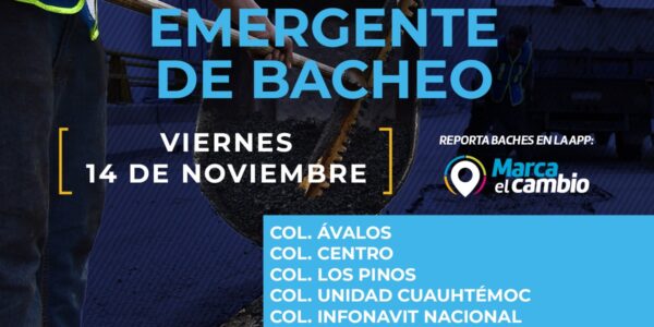 Ciudad de Chihuahua, Chih., El Gobierno Municipal, a través de la Dirección de Obras Públicas, realizará trabajos de bacheo este 14 de noviembre, mediante el programa emergente en calles de las colonias: Ávalos, Centro, Los Pinos, Unidad Cuauhtémoc, Infonavit Nacional,…