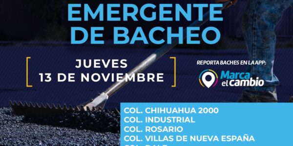 Ciudad de Chihuahua, Chih., El Gobierno Municipal, a través de la Dirección de Obras Públicas, realizará trabajos de bacheo este 13 de noviembre, mediante el programa emergente en calles de las colonias: Chihuahua 2000, Industrial, Rosario, Villas de Nueva España,…