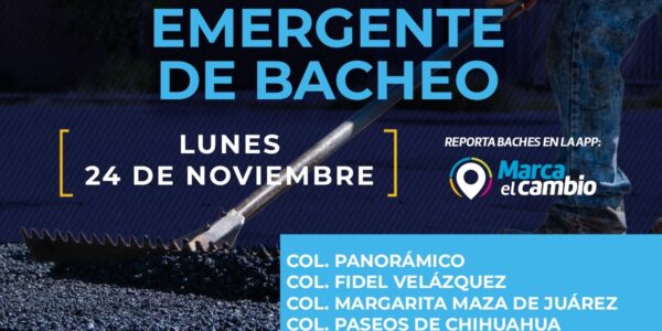 Ciudad de Chihuahua, Chih., El Gobierno Municipal, a través de la Dirección de Obras Públicas, realizará trabajos de bacheo lunes 24 de noviembre, mediante el programa emergente en calles de las colonias: Panorámico, Fidel Velázquez, Margarita Maza de Juárez, Paseos…