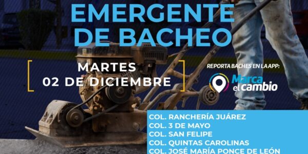 Ciudad de Chihuahua, Chih., El Gobierno Municipal, a través de la Dirección de Obras Públicas, realizará trabajos de bacheo este martes 2 de diciembre, mediante el programa emergente en calles de las colonias: Ranchería Juárez, 3 de Mayo, San Felipe,…