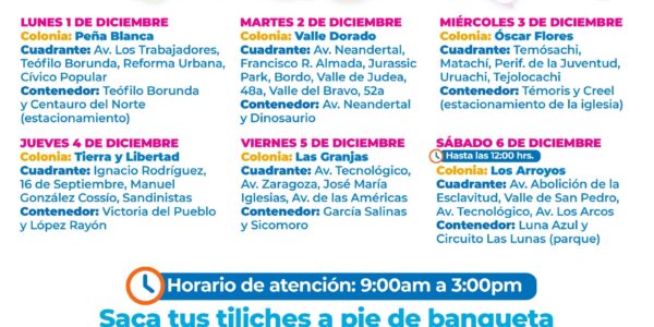 Chihuahua, Chih., El Gobierno Municipal de Chihuahua anunció el calendario del programa Destilichadero para la primera semana de diciembre con el fin de evitar la acumulación de desechos voluminosos en los hogares. Este tipo de basura no puede ser trasladada…