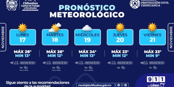 Ciudad de Chihuahua, Chih., El Gobierno Municipal de Chihuahua, a través de la Coordinación Municipal de Protección Civil, informa que durante esta semana se prevén mañanas frescas, así como tardes un poco más calurosas, por lo que exhortan a no…