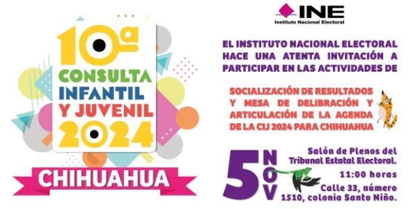 Chihuahua, Chih., El Instituto Nacional Electoral (INE) extendió una invitación a la ciudadanía para participar en el evento de Socialización y Mesa de Deliberación de Resultados de la Consulta Infantil y Juvenil 2024, un espacio destinado a analizar y compartir…