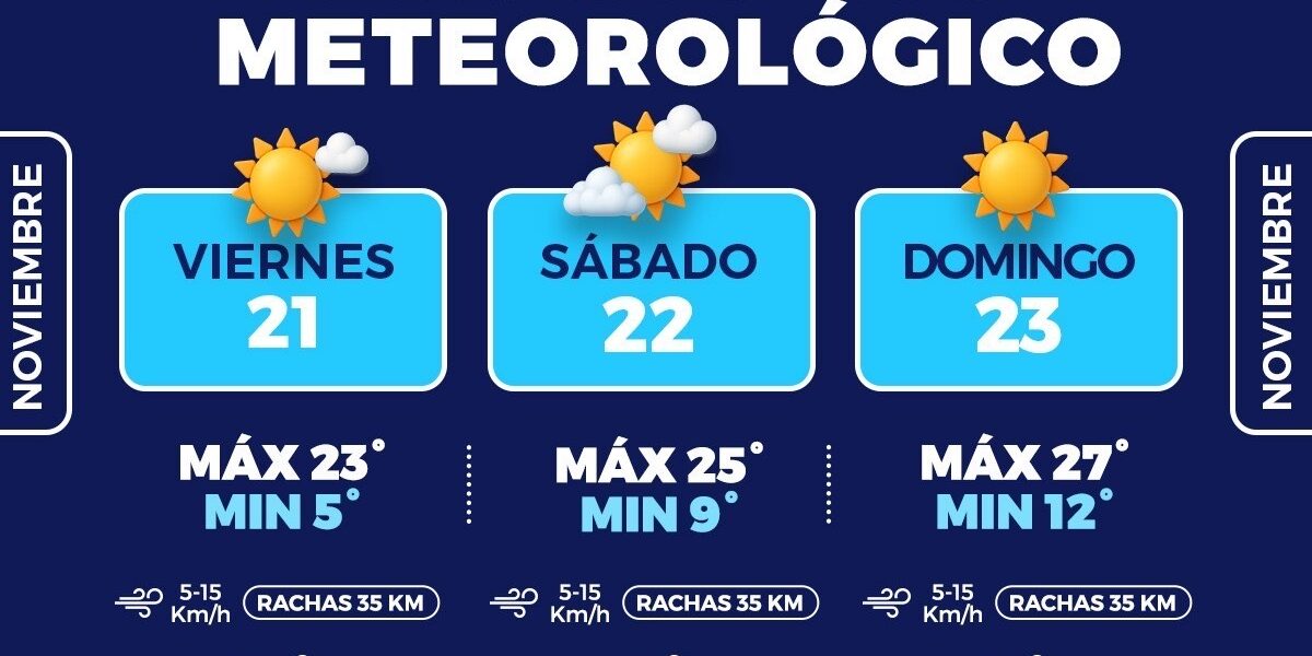 El sábado 22 registrará condiciones parcialmente nubladas, con temperaturas entre 25°C como máxima y 9°C como mínima, con viento en el rango de 5 a 15 kilómetros por hora, con ráfagas de hasta 35 kilómetros por hora.