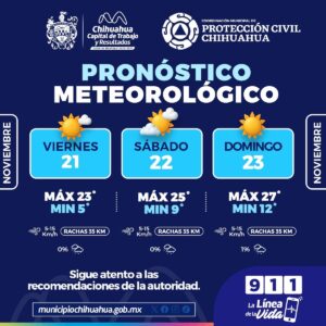 Ciudad de Chihuahua, Chih., El Gobierno Municipal de Chihuahua, a través de la Coordinación Municipal de Protección Civil, que las temperaturas se mantendrán a la baja este fin de semana y pide a la ciudadanía tomar las precauciones necesarias ante las variaciones de temperatura.