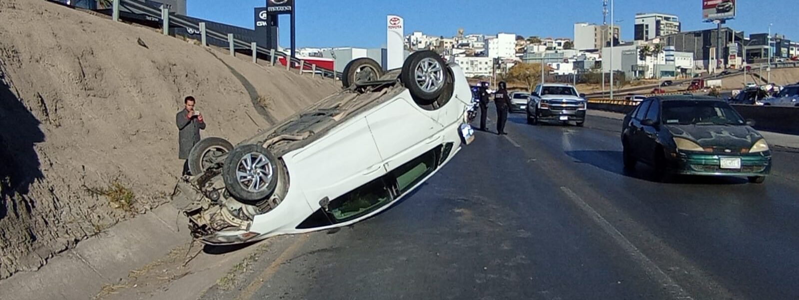 Chihuahua, Chih., Una mujer resultó ilesa tras volcar su vehículo Honda Fit mientras circulaba sobre el periférico y la Juventud en dirección norte-sur. El accidente ocurrió a la altura de la calle Hacienda Los Morales cuando la conductora perdió el control al tomar una curva, provocando que el automóvil impactara contra el muro de contención.
