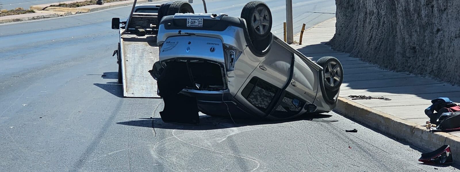 Chihuahua. – Un incidente casi de película se registró en la intersección del periférico R. Almada, cerca de la calle 38, cuando un Renault Stepway, conducido por un joven que perdió el control en una curva complicada, volcó al impactar contra la guarda de un póster ubicado en un vado.