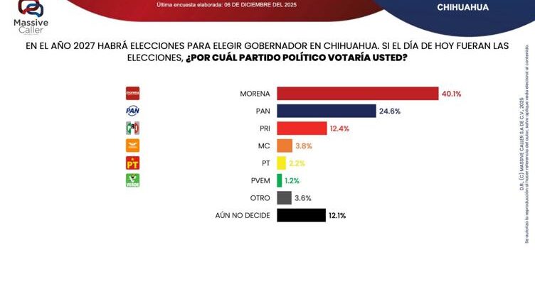 De cara a las elecciones intermedias de 2027, en las que Chihuahua renovará la gubernatura, la última encuesta de Massive Caller muestra que el 40.1% de la población se inclinaría por un candidato de Morena, mientras que 24.6% votaría por…